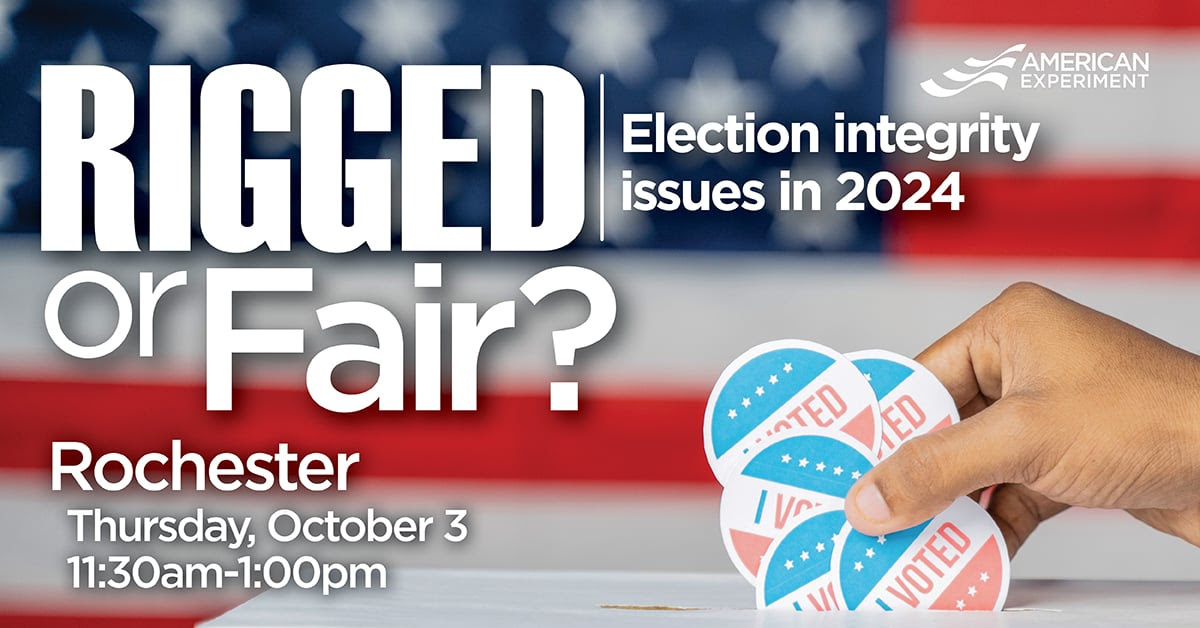 Join us on Thursday, October 3, in Rochester for RIGGED OR FAIR? Election Integrity Issues in 2024. You’ll learn whether Minnesotans trust the current election process and what they think about various voter integrity issues based on the latest Thinking Minnesota Poll, plus find out what you can do right now to ensure the integrity of Minnesota elections this November and beyond. |